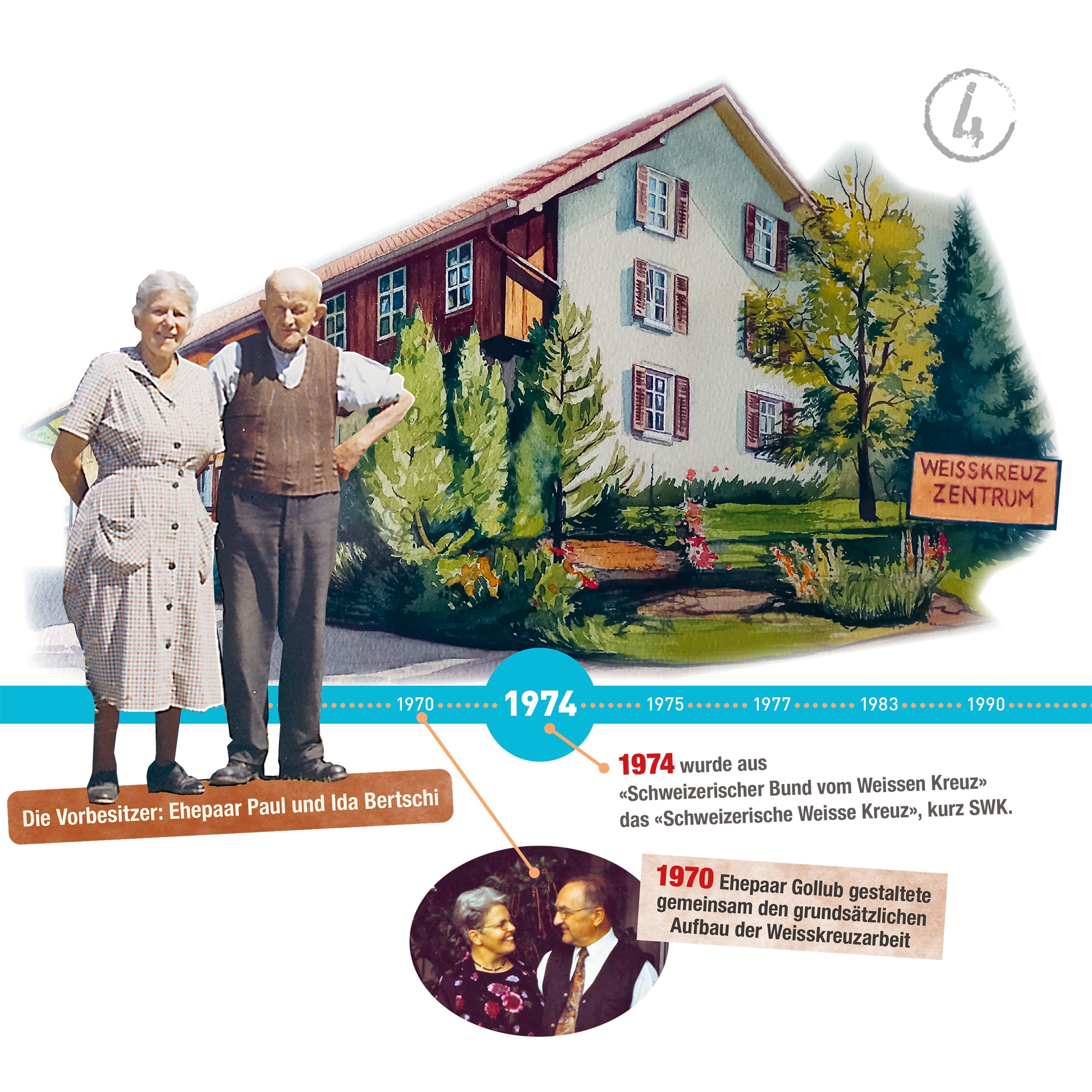 1970 starteten Ernst und Margrit Gollub mitsamt ihren 4 Töchtern einen 20-jährigen Einsatz beim Weissen Kreuz und zogen als 6-köpfige Familie in eine 4-Zimmer-Wohnung (davon zwei Büros) in ein ehemaliges Bauernhaus in Dürrenäsch. Dieses Haus gehörte dem Ehepaar Paul und Ida Bertschi, welche keine eigenen, dafür aber mehr als 20 Pflegekinder hatten.