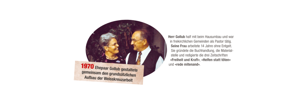 Das Ehepaar Gollub gestaltete den grundsätzlichen Aufbau der Weisskreuzarbeit und setzte sich dabei mit allen Kräften ein. Herr Gollub war aufgrund mangelnder Finanzen des Weissen Kreuzes zunächst 50 % angestellt, er half mit beim Hausumbau und war in freikirchlichen Gemeinden als Pastor tätig.